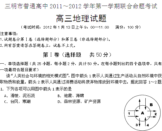 有道:福建省三明市普通高中2012届高三上学期联合命题考试地理试题