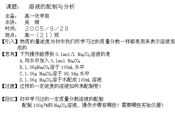 有道:江苏宝应中学高一化学教学案:溶液的配制与分析