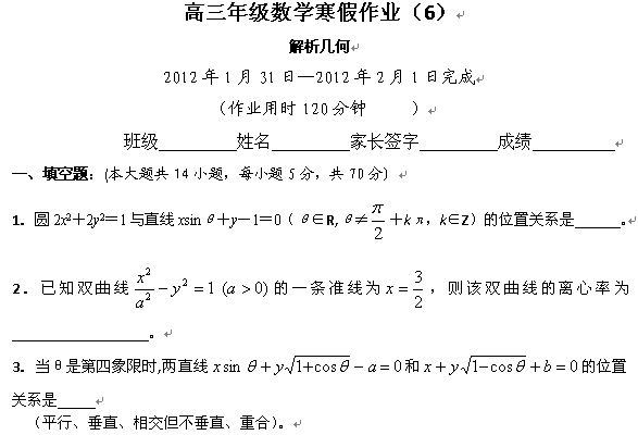 百度:江苏省兴化市2012届高三上学期寒假作业(六)(数学)