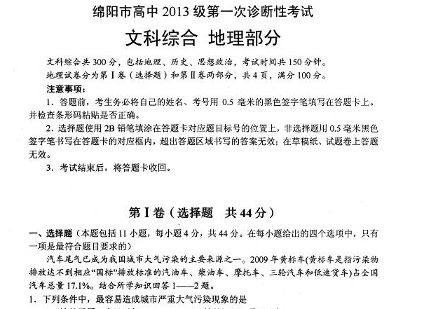 百度:四川省绵阳市2013届高三第一次诊断性考试文综试题(扫描版)