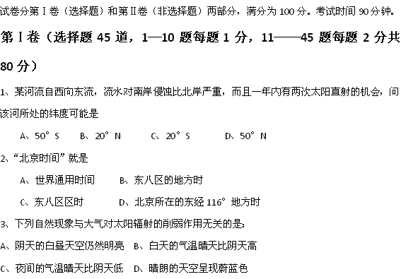 百度:河北省卢龙县木井中学2011-2012学年高一上学期期中考试地理试题(无答案)