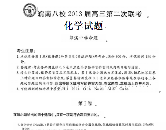 有道:安徽省皖南八校2013届高三12月第二次联考化学试题(扫描版)