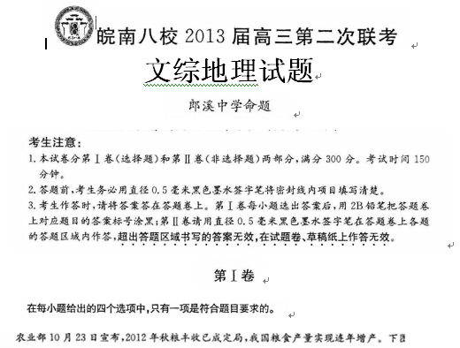 有道:安徽省皖南八校2013届高三12月第二次联考地理试题(扫描版)