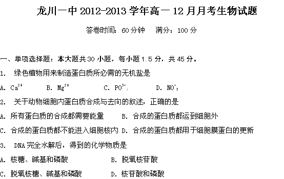 广东省龙川一中2012-2013学年高一12月月考生物试题