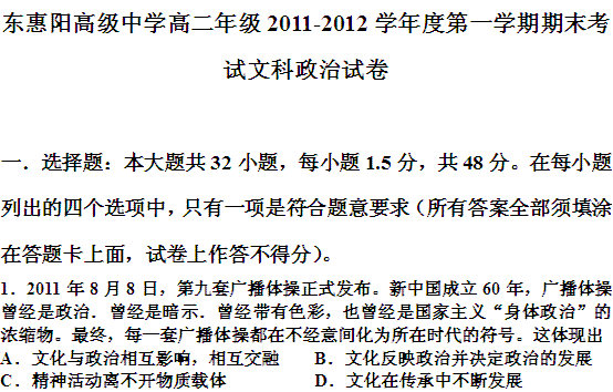 百度:《KS5U首发》广东省惠阳高级中学11-12学年高二上学期期末试题政治