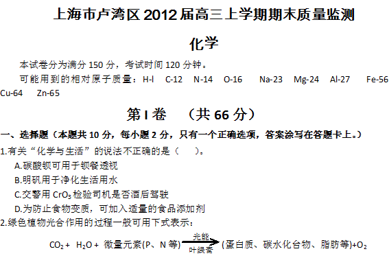 百度:上海市卢湾区2012届高三上学期期末考试 化学试题