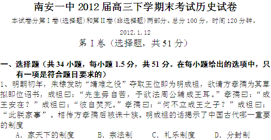 【ks5u首发】福建省南安一中2012届高三上学期期末试题历史