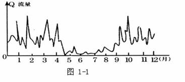 读图1-1“某河流量过程线示意图”(该河以降水补给为主),回答1~2题。