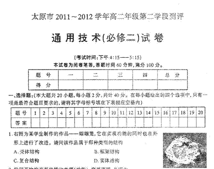 百度:山西省太原市11-12学年高二上学期第二学段测评试卷PDF通用技术