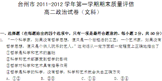 百度:《KS5U首发》浙江省台州市11-12学年高二上学期期末试题政治文