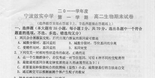 有道:浙江省宁波效实中学2011-2012学年高二上学期期末考试(生物)扫描版