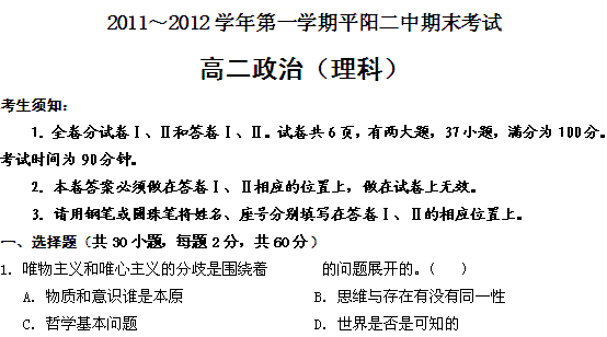 百度:《KS5U首发》浙江省平阳二中2011-2012学年高二上学期期末试题政治理