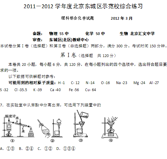 谷歌:北京市东城区示范校2012届高三下学期3月综合练习 化学试题