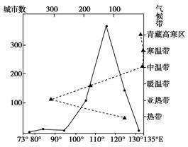 读下面我国不同经度范围和气候带城市数量分布图,回答1~2题。