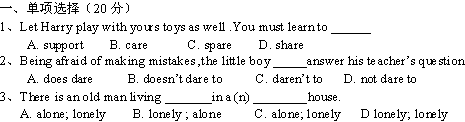 本试卷适合于使用新课标的英语基础较差的学校学生做,特别是广大欠发达的农村地区的学生做。