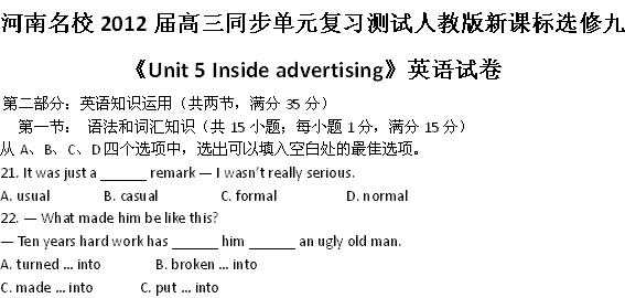 百度:河南名校2012届高考英语同步单元复习测试:Unit5 Inside advertising(新人教版选修9)
