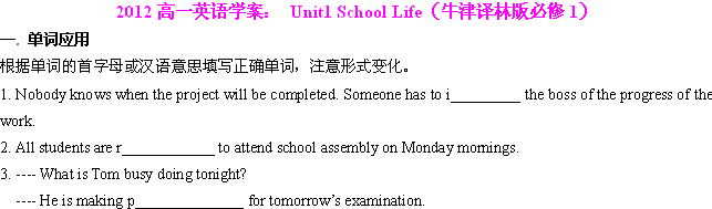谷歌:2012高一英语学案:Unit1 School Life(牛津译林版必修1)