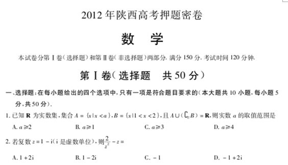 百度:2012年5月陕西省高考押题密卷数学(理)试题(扫描版)