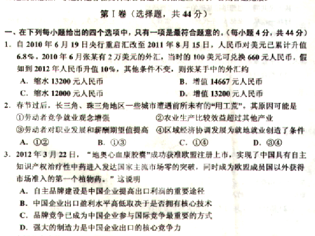 百度:天津市武清区2012届高三第三次模拟考试 政治试题(2012武清三模)PDF版 缺答案