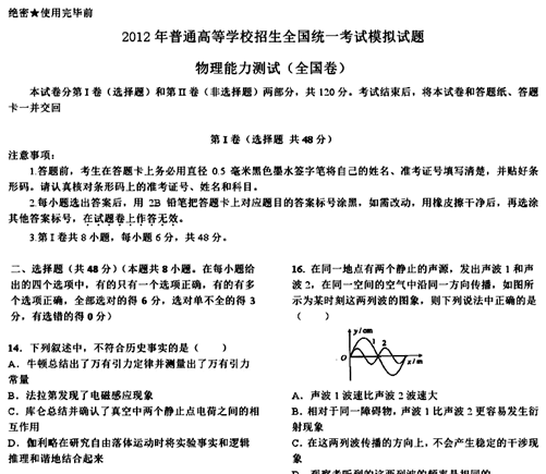 谷歌:2012年普通高等学校招生模拟考试物理试题(全国卷)扫描版