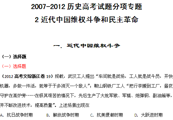 百度:2007-2012历史高考试题分项专题02 近代中国维权斗争和民主革命