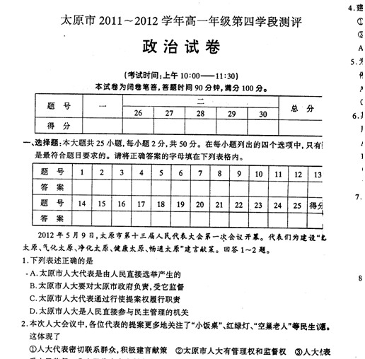 百度:山西省太原市2011-2012学年高一下学期期末考试政治试题(扫描版)