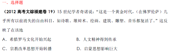 有道:2013最新题库大全2007-2012历史高考试题分项专题13 西方人文精神的起源与发展