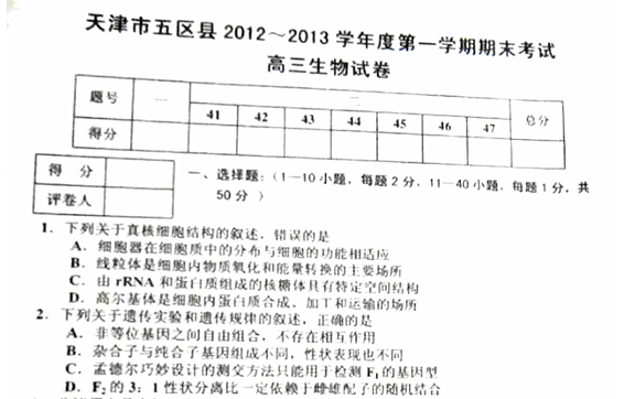 百度:天津市五区县2013届高三上学期期末考试生物试题 扫描版含答案