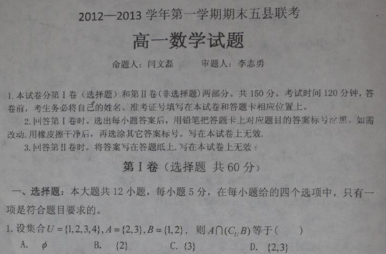 百度:河北省邯郸市2012-2013学年高一上学期期末五县联考数学试题 扫描版含答案