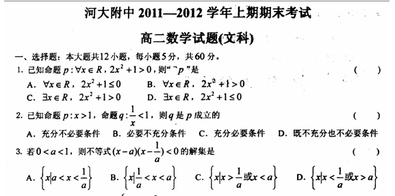 百度:河南省河大附中2011-2012学年高二上学期期末考试数学(文)试题 扫描版含答案