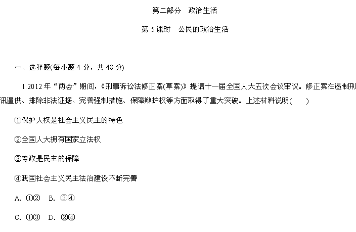 百度:二轮推荐2013届高中新课标二轮政治总复习 湖南用 限时训练 5(人教版) Word版含答案