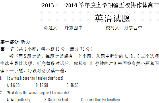 百度:辽宁省五校协作体2014届高三上学期期初考试 英语试题 Word版含答案