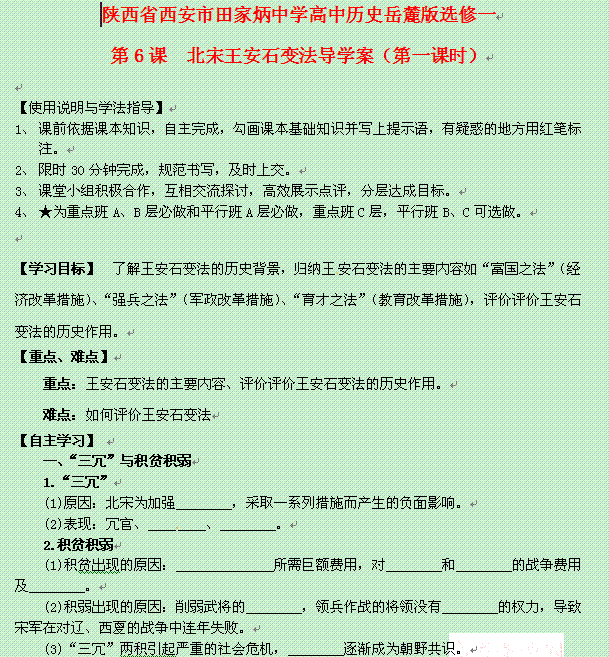谷歌:陕西省西安市田家炳中学高中历史学案: 第6课 北宋王安石变法(第一课时) (岳麓版必修2)