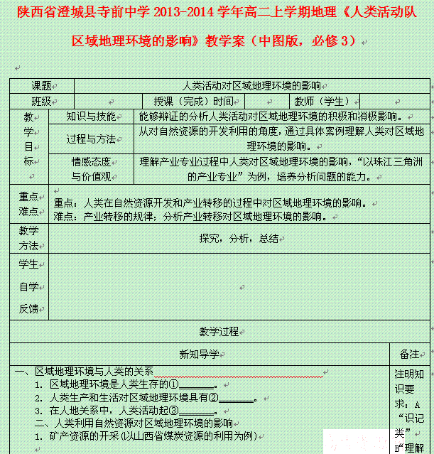 有道:陕西省澄城县寺前中学高二上学期地理学案:《人类活动队区域地理环境的影响》(中图版必修3)