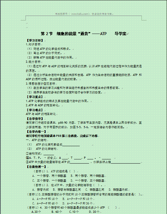 谷歌:2014年高一生物学案:第一章 第1节 细胞的能量“通货”——ATP 人教版