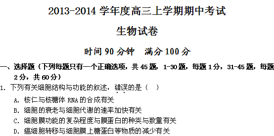 百度:《KS5U首发》辽宁省辽宁师大附中2014届高三上学期期中考试 生物试题 Word版含答案