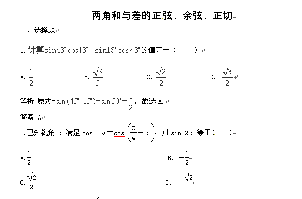 百度:2014届高三数学一轮复习提分训练题:两角和与差的正弦、余弦、正切 Word版含解析