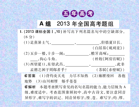 谷歌:《精品二轮》2014《5年高考3年模拟》高考复习(B版,新课标专用)专题精讲课件:专题十五 默写常见的名句名篇
