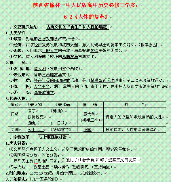 百度:陕西省榆林一中高中历史学案: 6-2《人性的复苏》(人民版必修3)