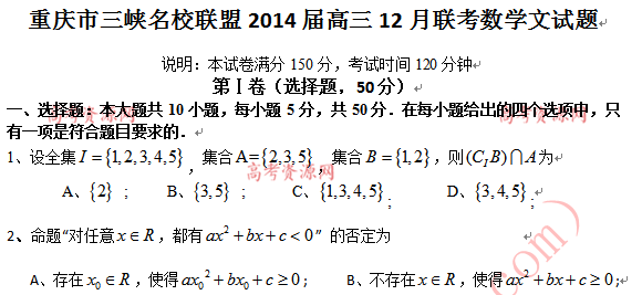 百度:重庆市三峡名校联盟2014届高三12月联考数学文试题 Word版含答案