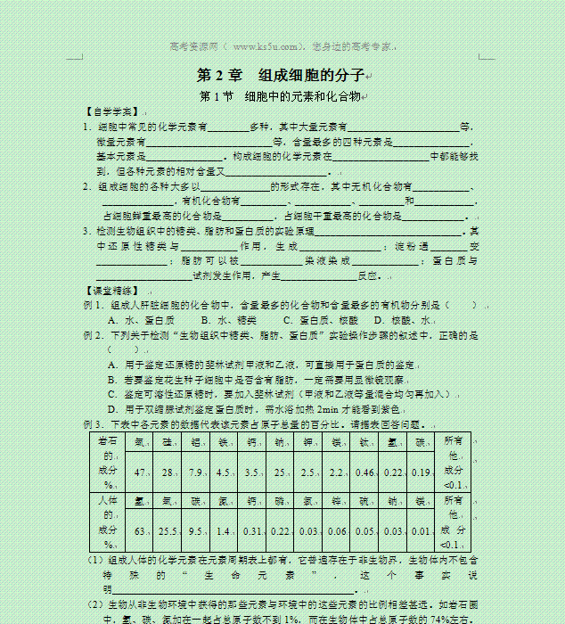 百度:2014年高考生物同步复习学案:2.1《细胞中的元素和化合物》 新人教版 必修1