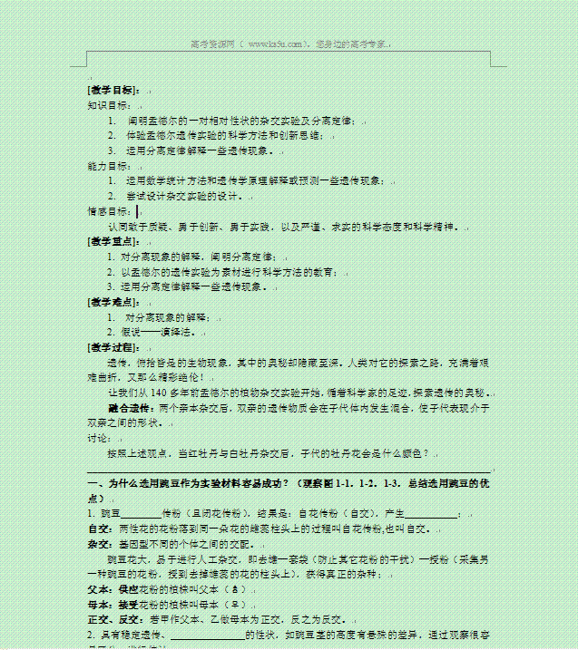 谷歌:湖南省怀化市湖天中学高一生物必修二教学案:1.1 孟德尔的豌豆杂交实验(一) (第一课时)人教版