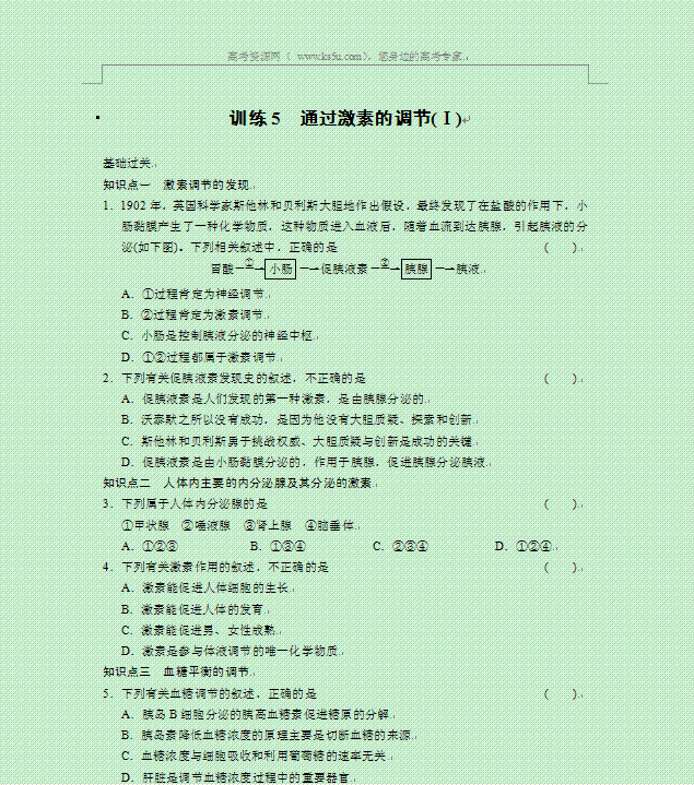 谷歌:2014届高三生物复习训练素材:2-5 通过激素的调节(Ⅰ)