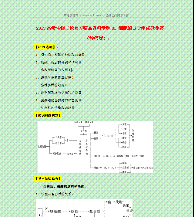 谷歌:2013高考生物二轮复习精品资料专题01 细胞的分子组成学案 人教版