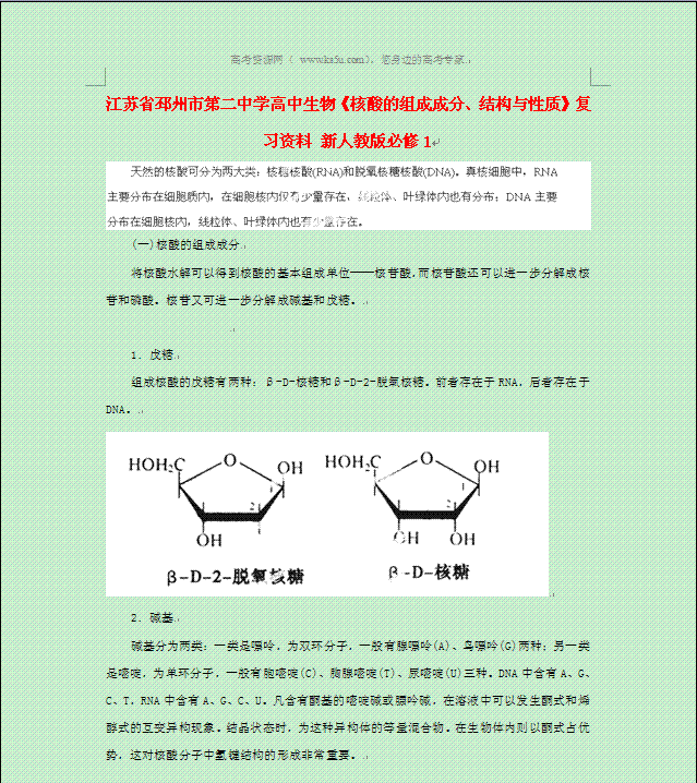有道:江苏省邳州市第二中学2014年高中生物复习教案:《核酸的组成成分、结构与性质》复习资料 新人教版必修1