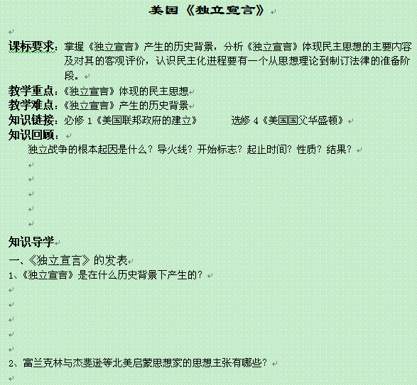 有道:高二历史教案: 第3单元第1课 美国《独立宣言》(新人教版选修2)