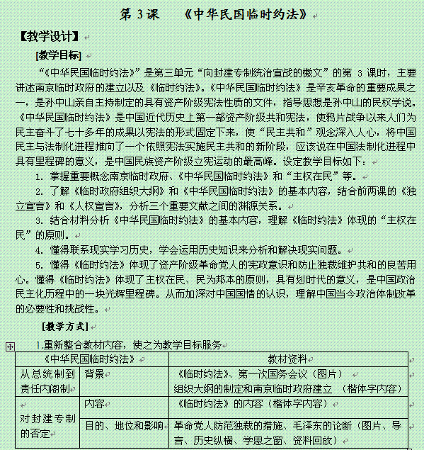 百度:高二历史教案: 第3单元第3课《中华民国临时约法》(新人教版选修2)
