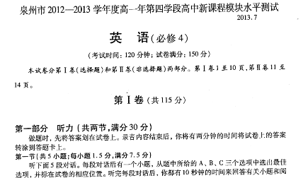 百度:福建省泉州市2012-2013学年高一第四学段模块水平测试英语试题 扫描版无答案