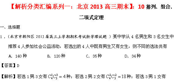 百度:《解析分类汇编系列一:北京2013高三(期末)理数》:10.排列、组合、二项式定理