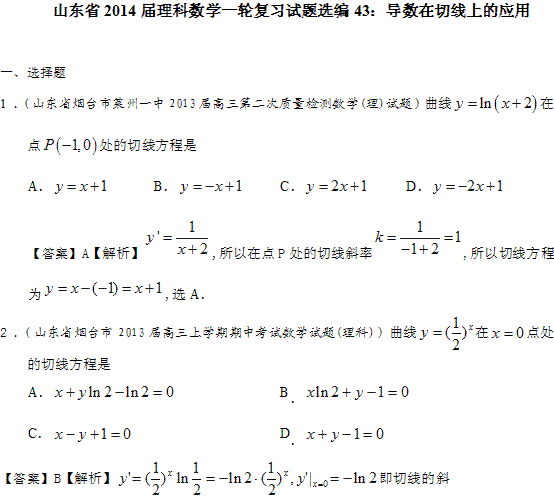 百度:山东省2014届理科数学一轮复习试题选编43:导数在切线上的应用(教师版) Word版含答案